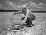W. G. Underwood, of the firm of Underwood and Ezell, points to the buried loud speaker which will conduct the sound right to cars' running boards at the new Bowie Boulevard Drive-In Theater, the first drive-in theater in Fort Worth, Texas, which will be worth $75,000. Underwood is wearing a long-sleeve shirt, trousers and eyeglasses.