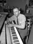 Franz Schubert, a descendant of the Austrian composer of the same name, is shown at work on a piano in his shop. He is wearing a collared shirt with cuffed sleeves, a necktie, trousers and eyeglasses.
