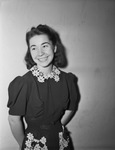 Mrs. Vance Snyder, the former Miss Nellie Lewis, married Vance Snyder (not pictured) on June 25, 1941, in Weatherford, Texas. She is the daughter of Mr. and Mrs. Walter Lewis. The bridegroom is the son of Mr. and Mrs. S. H. Snyder. Wedding attendants included Mr. and Mrs. Tommy Lewis, of Fort Worth, Texas. Mrs. Vance Snyder is shown standing against a bare wall. She is wearing a dark-colored dress with a floral crochet collar and matching detailing on the skirt pockets. She is smiling.