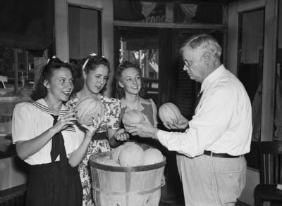 Grapevine Cantaloupe Festival. Mayor B. B. Wall, presenting cantaloupes to out of town guests, left to right, Misses Jane Mangold, Granbury, and Betty Jo Quillin and Edith Lipscomb, Houston, Texas.