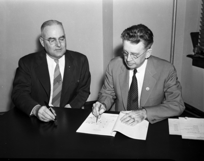 Uel Stephens (left) assistant director of Public Works Administration, and George F. Harley, director. The two men are shown seated at a table together, both looking over a book Harley has open. Both are dressed in suits and are wearing eyeglasses. The page that Harley is pointing out to Stephens has a map of Texas.