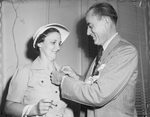 Post office workers convention. L. E. Underwood, El Paso, pinning a badge on Mrs. Noel D. Patterson of Waco.