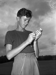 Fred Hudgins, adding up his golf score on a scorecard. He is standing outside, wearing a t-shirt and trousers. Hudgins is one of the leading contenders in the Fort Worth, Texas, junior golf tournament, which will be held at Ridglea Country Club.