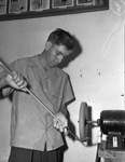Young golfer Charles "Spud" Cason is shining a golf club on a polishing wheel. He is one of the leading contenders in the Fort Worth, Texas, junior golf tournament, which will be held at Ridglea Country Club. Cason won the championship in 1939. He is wearing a short-sleeve collared shirt and trousers.