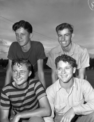 Young golfers competing in the Fort Worth, Texas, junior golf tournament include (front row, left to right) Porter Vaughn and Johnny Cassol, and (back row) Fred Hudgins and Charles Cason. The golfers are outdoors; the pair in the front row are kneeling and the two in the back are standing, bent slightly forward. Vaughn and Hudgins are wearing t-shirts and Cassol and Cason are wearing collared shirts.