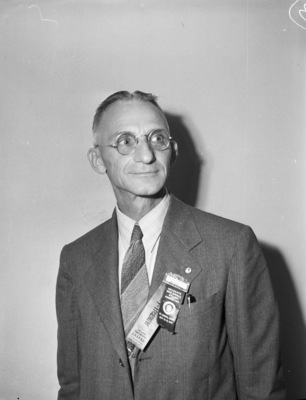 Four postal organizations concluded a joint state convention with election of officers at Hotel Texas. N. C. Hartig, of El Paso, Texas, was elected president of the Texas Branch of the United National Association of Post Office Clerks. He is standing against a wall, wearing a suit, necktie and eyeglasses. There are ribbons pinned to the lapel of his suit jacket.