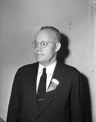 Four postal organizations concluded a joint state convention with election of officers at Hotel Texas. James A. Hill Junior, of Dallas, Texas, was elected president of the Texas State Federation of Federal Employee Unions. He is standing against a wall, wearing a suit, necktie and eyeglasses. He has a ribbon identifying him as a "delegate," pinned to the lapel of his suit jacket.