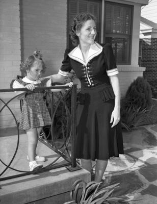 Mrs. Robert C. Stow Junior and her daughter, Carolyn, who came to live in Fort Worth, Texas, with Dr. Stow after making their home in Houston, Texas, where Dr. Stow interned at Hermann Hospital. Mrs. Stow is the former Miss Jean Fallis, daughter of Mr. and Mrs. L. D. Fallis. Mrs. Stow is shown standing outside her home, wearing a dress with buttons down the bodice and a wide collar. Carolyn is standing on the front porch, wearing a plaid print dress.