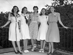 Hicks Field cadets spent a weekend afternoon dancing at the Elks Club. They were hosted by ten women, half of whom are shown here: (left to right) Misses Sarah Cooke, Leslie Anne Ligon, Mary Catherine Elliott, Virginia Stogner and Jayne Miller. Miss Stogner sponsored the dance, naming the hostesses and inviting a group of young women to be among the dancing partners for the cadets. The tea dance was attended by about 100 people. The hostesses are shown standing on a balcony. Miss Cooke is wearing a light-colored dress with a contrasting color collar and piping down the center. Miss Ligon is wearing a dress and a polka-dot kerchief tied under the dress collar. Miss Elliott is wearing a patterned, button-down dress belted at the waist. Miss Stogner is wearing a dress with an eyelet design on the bodice. Miss Miller is wearing a pleated, button-down dress.