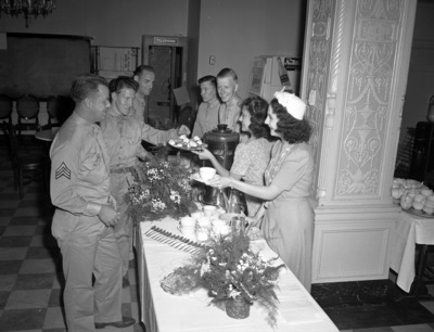 Soldiers are gathering around a table, being served free coffee and cookies at the United Service Organization (U. S. O.) headquarters at Hotel Texas. The soldiers are, left to right, Sergeant R. M. Anderson, from Camp Bowie, Private John Wilk, New York, from Camp Wolters, Private Frank Green, from Camp Bowie, Private Jim Bogle, from Camp Barkeley, and Staff Sergeant Joe Von Helf, from Camp Barkeley, Miss Sylvia Rosenthal and Miss Felice Richker are serving the soldiers the coffee and cookies; they are hostesses representing the Jewish Welfare Board. Miss Rosenthal is wearing a floral print dress. Miss Richker is wearing a dress and a hat. The soldiers are wearing their military uniforms. On the table are flower arrangements, a coffee machine and various tableware.