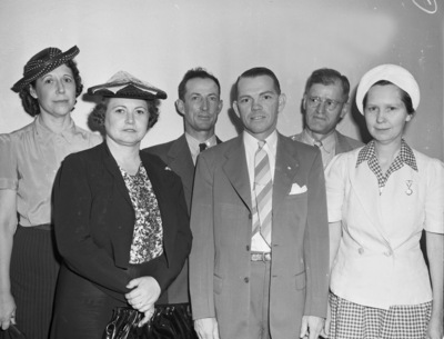 A delegation of more than 40 people will go from Fort Worth, Texas, to Amarillo, Texas, for the joint convention of the National Federation of Post Office Clerks, National Association of Letter Carriers, and National Association of Postal Supervisors. Heading the delegation of clerks an auxiliary members will be, left to right, Mrs. E. J. Lewis, Mrs. W. M. Lowrance, A. P. Willis, E. J. Lewis, H. E. Shamburger and Mrs. A. P. Willis. Mrs. Lewis is wearing a hat. blouse and a pleated skirt. Mrs. Lowrance is wearing a blazer, blouse and a skirt and is holding a handbag. Mr. Willis, Mr. Lewis and Mr. Shamburger are wearing suits. Mrs. Willis wearing a checkered dress, a blazer and a hat.