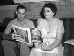 Miss Ruby Edna Pierce and her nephew, Richard Pierce, both of Palm Beach, Florida, are reading an issue of Palm Beach Life magazine, of which Miss Pierce is the editor. In Fort Worth, Texas, en route to California and Alaska, the two are guests of Miss Pierce's sister, Mrs. A. A. Cunningham, and Mr. Cunningham. Miss Pierce and Richard are sitting on a couch. Miss Pierce is wearing an eyelet stitch dress with a brooch at the center of the neckline and eyeglasses. Richard is wearing a checkered shirt and trousers.