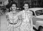 Miss Sue Kathryn Walker of Vandalia, Illinois, left, and Miss Martha Hammond, who are enjoying Sue Kathryn's visit to Fort Worth, Texas. She is the guest of her aunt, Mrs. Star Williams. They are walking on a sidewalk, holding hands. A car is parked on the street at right. Miss Walker is wearing a striped dress with buttons all down the front and a belt. Miss Hammond is wearing a plaid print dress. Miss Walker is the daughter of Mr. and Mrs. B. Walker.