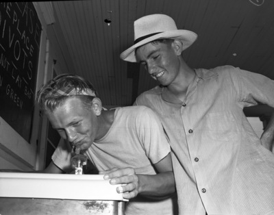 Jimmy Ted Ramsel, drinking at a water fountain, and Charles "Spud" Cason, right, cool off after playing in the opening round in the Fort Worth, Texas, junior golf tournament at Ridglea Country Club. Ramsel is wearing a t-shirt. Cason is wearing a striped, button-up shirt and a hat.