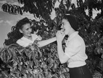 Fair's Beauties is a popular variety of peaches (shown on the tree) in Parker County. Miss La Frieda Williams, left, 17, is offering a bite of a Parker County peach to her cousin, Miss Tennie Marie Dyer, 17, of Lamesa, Texas. Miss Williams is the daughter of Mr. and Mrs. F. E. Williams, who operate a fruit farm southwest of Weatherford, Texas. A bumper peach crop of 1,000,000 bushels has been estimated for Parker County.