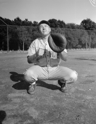 Amateur baseball player Horace Fowler, of the Worth Hotel nine. Mr. Fowler is shown knelt down and looking ahead with his catcher's glove raised. He is wearing his Worth Hotel baseball uniform and a baseball cap. He will be the starting catcher for the American-National League all-star team in the upcoming game at LaGrave Field. Behind him, the rest of the field, a wire fence and multiple trees can be seen.