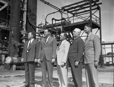 The refinery of the Ohio Oil Company was taken over by officials of the Premier Oil Refining Company of Longview, Texas. The refinery has a daily capacity of 5,000 barrels of crude oil. Officials of Premier who were in Fort Worth, Texas, to take over the refinery were, left to right, D. D. Pickrell, of Ranger, Texas, pipeline superintendent; R. P. Hargis, of Longview, Texas, secretary-treasurer; L. G. Dufilho, of Longview, Texas, general refinery manager; H. L. Megan, superintendent of the Fort Worth, Texas, refinery; and E. E. Jackson, of Longview, Texas, sales manager of Premier Oil Company. All five men are wearing suits. They are standing outdoors, looking around at the refinery.