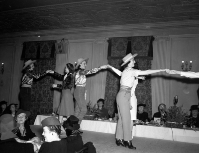 Image shows shots of dancers performing a new dance called the "Big Bend", the women are models from the Fair, which presented a style revue of outdoor wear for women and dancing pupils of Miss Elizabeth King. The speakers tables can be seen in the background. Published in the Fort Worth Star-Telegram evening edition February 10, 1940.
