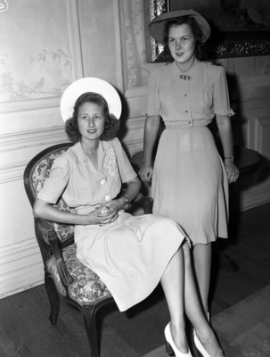 Miss Marjorie Thompson, seated, left, and Miss Muriel Flynn, standing, right, both of Dallas, Texas, attended a party at the Fort Worth Club hosted by Miss Madeline Fisher in honor of her house guest, Miss Marilyn Williams. All four women were classmates at Stephens College in Columbia, Missouri. Miss Thompson is wearing a dress with buttons down the bodice, a hat, high heels, and a watch on her left wrist. Miss Flynn is wearing a dress with a belt at the waist and a brooch pinned at the base of the collar, a hat, and a watch on her left wrist.