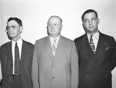 Three of the just-announced new staff officers for the North Fort Worth Lodge of the Independent Order of Odd Fellows (I. O. O. F.) include (left to right) E. B. Hulme, vice grand, J. R. Lingo, noble grand of Lodge No. 318, and Y. E. Cash, noble grand of Lodge No. 103. The three men are standing in front of a white wall. Mr. Hulme has his suit unbuttoned and he has a clip on his tie. Mr. Lingo is wearing a gray suit and a striped tie. Mr. Cash is wearing a black suit with a striped tie; on his left suit pocket there is a visible handkerchief and he is crossing his arms behind his back. Published in the Fort Worth Star-Telegram evening edition, July 17, 1941.