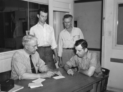 T. L. West (seated left) is defense bonds chairman for employees of the Hobbs Manufacturing Company at 609 North Main Street. Here he is signing up W. A. Ash (seated right) while two more customers, Floyd Casstevens, Junior, (standing left) and Roy Glover (standing right), stand by and wait their turn. Mr. West and Mr. Ash are sitting at a desk and Mr. Casstevens Jr. and Mr. Glover are standing between them. There are sheets of paper and a rectangular case on the desk. All four men are wearing collared shirts and trousers.