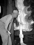 Operations were unbroken when the Premier Oil and Refining Company took over the Ohio Oil Company refinery in Fort Worth, Texas. Shown here is a scene within the refinery after Premier had assumed control. H. L. Smith is shown checking the temperature machine in the wax plants. He is wearing a long-sleeve collared shirt, trousers and a hat.