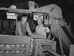 Operations were unbroken when the Premier Oil and Refining Company took over the Ohio Oil Company refinery in Fort Worth, Texas. Shown here is a scene within the refinery after Premier had assumed control. T. C. Patterson (left) and Sam Grubbs are shown in the packing department. They are watching cans of oil move along a conveyor belt. Patterson is wearing a long-sleeve shirt, overalls and a hat. Grubbs is wearing a collared shirt and a hat.