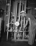 Operations were unbroken when the Premier Oil and Refining Company took over the Ohio Oil Company refinery in Fort Worth, Texas. Shown here is a scene within the refinery after Premier had assumed control. W. M. Patterson is shown tightening a screw on one of the machines inside the refinery. He is wearing a shirt, hat, and striped overalls. The machine is made up of several pipelines and has a gallon gauge affixed to one of the pipes.