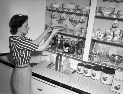 Mrs. James C. Roberts, the former Margaret Liston, was married April 15, 1941. She is shown in her kitchen, grabbing a stack of plates from a cupboard. She is wearing a striped blouse and a skirt with a belt. Lining the cupboard shelves are plates, teacups, glasses, and various condiments and food items, including salt and grape juice. On the kitchen counter are containers and jars for alcohol and other foods.