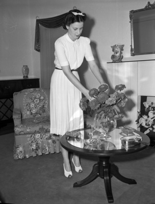 Mrs. James C. Roberts, the former Margaret Liston, was married April 15, 1941. She is shown in her living room, arranging zinnias in a vase on a small, round table. She is wearing a dress with a pleated skirt and a belt at the waist. Behind her is a floral print chair.