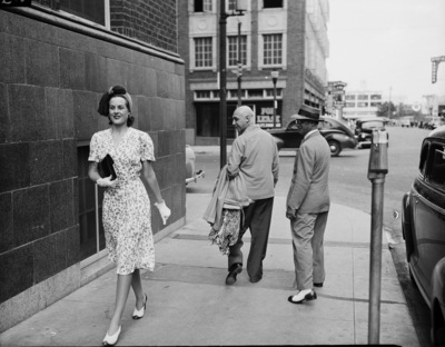 Exhibitors in Fort Worth, Texas, for the National Fashion Exhibitors, Incorporated, semi-annual style show opening at Hotel Texas were looking for potential models for the show. Harry L. Rose, of Los Angeles, California, center, and Herman Shankin, of San Antonio, Texas, right, spotted Jean Harris, left, walking on the sidewalk, and offered her a modeling job. Miss Harris is wearing a floral print dress, gloves and a scarf in her hair. She is holding clutch purse in her right hand. Rose and Shankin are wearing suits. Rose is carrying sports clothes that will be featured in the show. At the right, at the edge of the sidewalk, is a parking meter, and a car is parked beside it on the road.