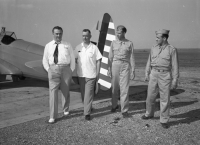 Governor W. Lee O'Daniel at Hicks Field. Left to right, Governor W. Lee O'Daniel, A. W. Meadows, commandant; Captain D. E. Hooks, commanding officer, and Lieutenant R. F. Askew, commandent of cadets.