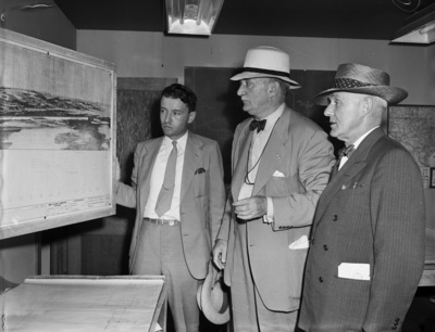 William S. Knudsen, center, whose job is to speed the Nation's warplanes, and Major General G. H. Brett, right, Army Air Corps chief, being shown sketch of Lake Worth bomber plant by Captain John H. Anderson. Published Fort Worth Star-Telegram Morning Edition July 19, 1941.