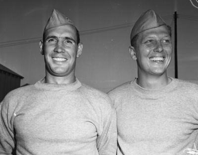 Hicks Field. U. S. Air Corporation. Athletes. Left to right, Jack Fletcher, Mississippi State Footballer; and Jeff Oser, L. S. U. footballer. Fort Worth Star-Telegram Morning Edition. 1941-07-20. Photograph of two male military athletes. Both are wearing matching sweat shirts and military caps.