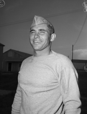 Hicks Field. U. S. Air Corporation. Athletes. F. R. Hodges, Millsaps College footballer. Fort Worth Star-Telegram Morning Edition. 1941-07-20. Photograph of a young male soldier athlete. He is wearing a sweatshirt and a military cap.