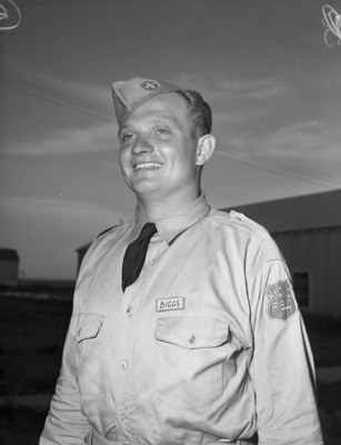 Hicks Field. U. S. Air Corporation. Athletes. J. T. Biggs, South Carolina University football player. Fort Worth Star-Telegram Morning Edition. 1941-07-20. Photograph of young, male military soldier and athlete. He is wearing his military uniform.