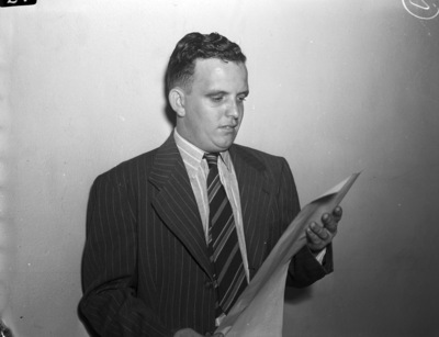 George Oliver Wyatt Junior was among the 1,250 Tarrant County 21-year-olds affected by the Selective Service drawing in the new draft lottery. He is standing against a wall, wearing a pinstripe suit and a striped necktie. He is holding and looking at a piece of paper.