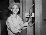 Roy Cecil Haggard was one of Tarrant County's 21-year-old Selective Service registrants whose number turned up early in the national lottery. Haggard is pictured at work at the Arlington Heights Electric Company, fixing some electric wiring. He is wearing a hat and a collared, button-down shirt and is holding a pair of pliers. Haggard is married and has a nine-month-old daughter. His number was the second to turn up in Selective Service Board No. 2.