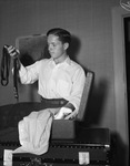 Johnnie Albert Pearson was one of Tarrant County's 21-year-old Selective Service registrants whose number turned up early in the national lottery. He is shown storing away civilian clothes he will not need in the Army. His was the first number called in Selective Service Board No. 7. He is packing clothes into a suitcase that is stacked atop a larger case. Pearson is wearing a long-sleeve, button-down shirt, trousers and a belt.