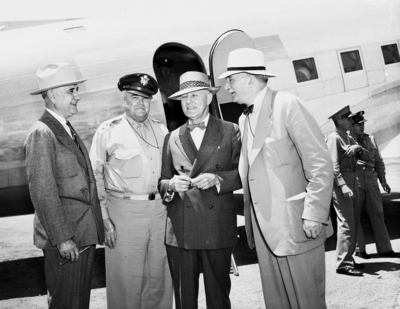 Left to right, Amon Carter, greetings the vistitors at the airport. Major General G. C. Brant is second from left, and Major General George H. Brett and William S. Knudsen are at the right.