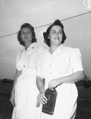 Second Lieutenants K. S. Babb (left) and R. J. Guental, nurses serving at Camp Barkeley Hospital, came equipped with cameras to photograph the 45th Division review. They are standing outside, both wearing nurses' uniforms. Lieutenant Nurse Guental is holding a camera.