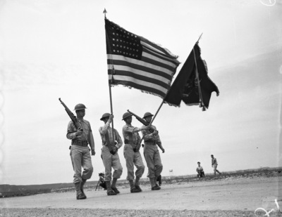 Camp Barkeley; Flags; Military personnel; Military uniforms; Military parades & ceremonies; Military Reviews; Flag bearers; Color Guards; Rifles; Flags--United States