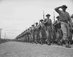 A typical infantry unit from Company B, 180th Infantry, at the 45th Division review at Camp Barkeley. The soldiers are wearing their military uniforms and carrying rifles as they walk along a road.