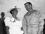 Brigadier General Joseph Atkins, chief of staff of the Third Army, welcomes Mrs. Antonio Barkeley, mother of David Barkeley after whom the present home of the 45th Division is named. Mrs. Barkeley is wearing a dress and a sunhat. A flower is pinned to her dress near the neckline. General Atkins is wearing his military uniform. An unidentified man is standing in the background at the far left.