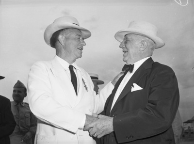 Among the guests at the review of the 45th Division at Camp Barkeley were two former commanders of infantry divisions now stationed in Texas. They are Major General Roy Hoffman, left, 45th Division, and Brevet Lieutenant General John A. Hulen, of the 36th division. Major General Hoffman is wearing a suit with a necktie and a hat. Brevet Lieutenant General Hulen is wearing a suit with a bow tie, a hat and eyeglasses.