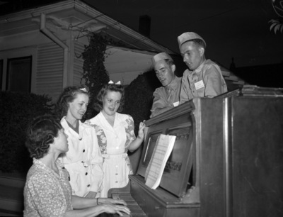 Two members of the Burton Class of Central Methodist Church, and two of the 30 Camp Wolters soldiers entertained by the class at the United Service Organization (U. S. O.) center at Hotel Texas, join in a song as Mrs. Marcus M. Chunn, wife of the pastor, plays accompaniment. Mrs. Chunn is seated at the piano. Standing left to right are Mrs. Loutitia Armstrong, class president; Miss Alain Maddox; Private Howard Cross, of Madison, Wisconsin; and Private Jess Dickerson, of Wayne, West Virginia. The privates are wearing their military uniforms. Mrs. Chunn is wearing a floral print dress. Mrs. Armstrong is wearing a buttoned-up coat and a bow in her hair. Miss Maddox is wearing a button-down dress, pearl necklace and a bow in her hair.