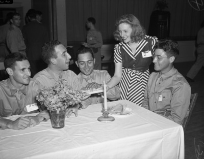 Miss Madlyn Brachman serves supper to Camp Bowie soldiers prior to a dance at the Hebrew Institute. The soldiers are, left to right, Private Jesse Goldstein, of Pittsburgh, Pennsylvania; Private Henry Morris, of Minneapolis, Minnesota; Private Frank Friedman, of Saint Louis, Missouri; and Private George Lieberman, of Chicago, Illinois. Miss Brachman's mother is Mrs. Elias Brachman, who used to serve soldiers training in Ohio during World War I. Miss Brachman is wearing a striped dress. The soldiers are sitting at a dining table, wearing their military uniforms. On the table is a floral centerpiece and a candle.