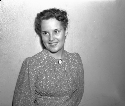 Mrs. Carl L. Lampley, the former Miss Bette Hauser, whose marriage took place July 18, 1941, is the daughter of Mr. V. M. Hauser. The bridegroom is the son of Mr. and Mrs. G. C. Lampley, of Lake Worth, Texas. Mrs. Carl Lampley is shown standing against a bare wall, wearing a clover print dress with a cameo brooch pinned near the collar.