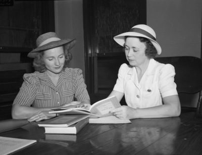 Red Cross volunteer Women's Motor Corps leaders Mrs. W. H. Slay Junior, a lieutenant (left) and Mrs. Roger Owings, Captain of the Fort Worth Corps. The women are seated by a table and together are going over some material. Published in the Fort Worth Star-Telegram morning edition, July 24, 1941.
