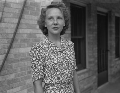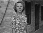 Miss Nellie Frances Thomas is a recent high school graduate. She spent the last month enjoying her summer vacation in Galveston, Texas, with her mother, Mrs. J. B. Thomas. Miss Thomas is planning to attend National Park College in Forest Glen, Maryland, next fall. She is shown standing in front of her house, wearing a floral dress.